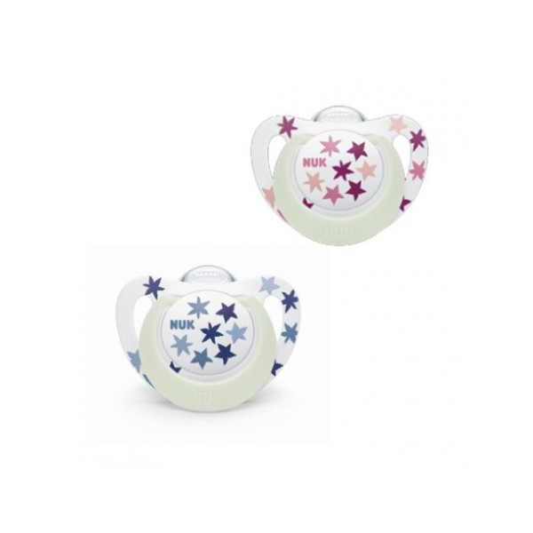 La sucette nocturne NUK aide les bébés à trouver plus facilement leur chemin vers le pays des rêves. Grâce au matériau brillant pour bébé, les sucettes émettent une légère lueur dans l’obscurité et peuvent être trouvées rapidement et facilement, même la nuit.